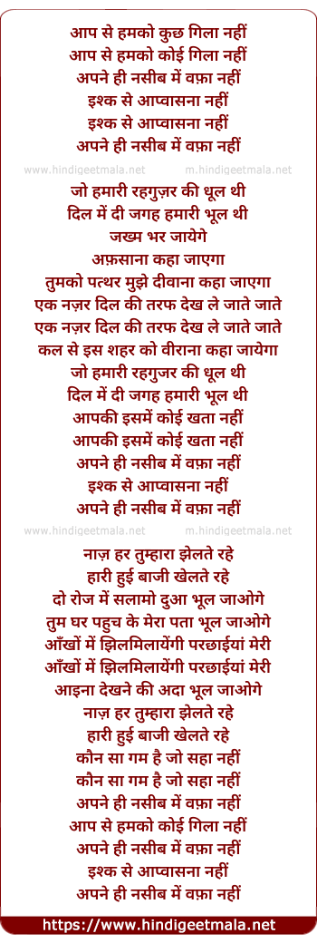 Lyrics of Aap Se Hum Ko Kuch - आप से हमको कुछ गिला नहीं