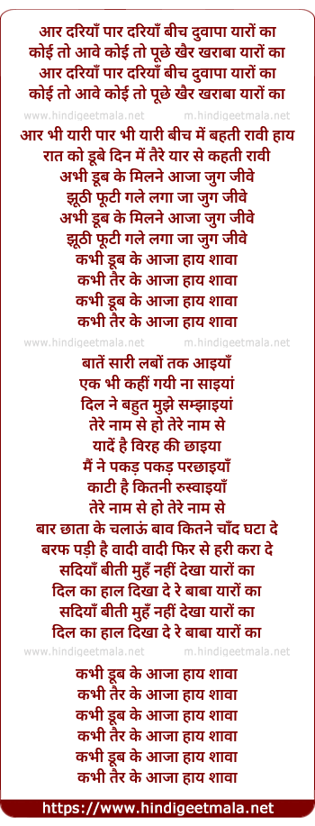 Lyrics of Aar Dariyaa Paar Dariya - आर दरियाँ पार दरियाँ