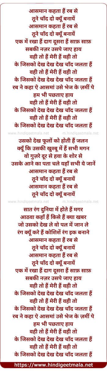 Lyrics of Aasamaan Kahataa Hai Rab Se, Vahi To Hai Meri - आसमान कहता हैं रब से , वही तो हैं मेरी