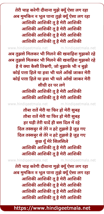 Lyrics of Aashiqui Aashiqui Tu Hai Meri Aashiqui - आशिकी आशिकी तू है मेरी आशिकी