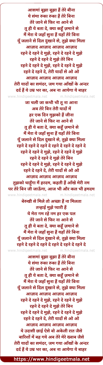 Lyrics of Aasmaan Bhuja Bhuja Hai (Rehne De) - आसमां बूझा बूझा हैं तेरे बीना