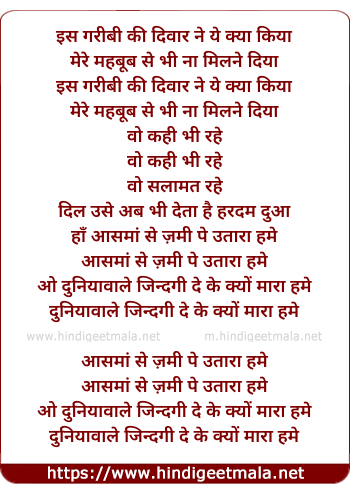 Lyrics of Aasman Se Zameen Pe Utaara - II - इस गरीबी की दिवार ने ये क्या किया