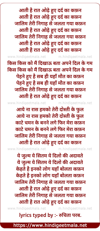 Lyrics of Aati Hai Raat Odhe Hue Dard Ka Kafan - आती है रात ओढ़े हुए दर्द का कफ़न