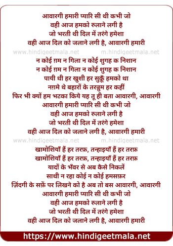 Lyrics of Aavaragi Hamari Pyari Si Thi Kabhi Jo - आवारगी हमारी प्यारि सी थी कभी जो