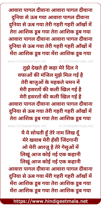 Lyrics of Aawara Pagal Diwana Dunia Se Ub Gaya - आवारा पागल दीवाना दुनिया से ऊब गया