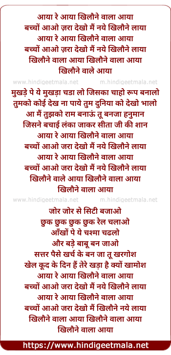 Lyrics of Aaya Re Aaya Khilone Wala Aaya, Bachcho Aao Zara Dekho - आया रे आया खिलौने वाला आया, बच्चों आओ ज़रा देखो