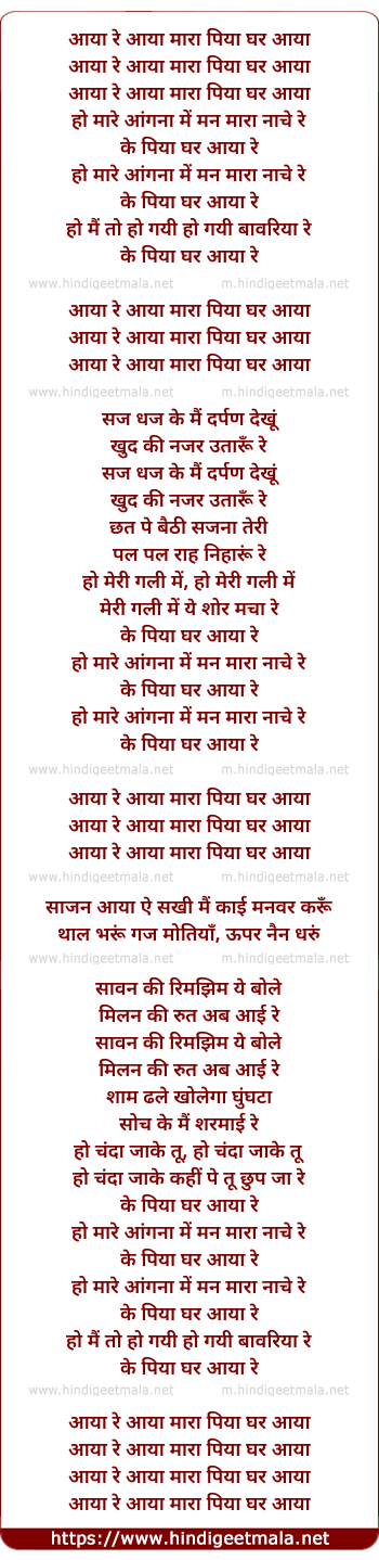 Lyrics of Aaya Re Aaya Mara Piya Ghar Aaya - आया रे आया मारा पिया घर आया