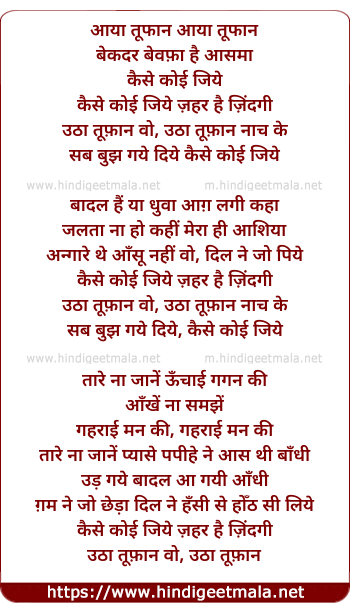 Lyrics of Aaya Tufaan, Kaise Koyi Jiye Zeher Hai Zindagi - आया तूफान, कैसे कोई जिये ज़हर है जिंदगी