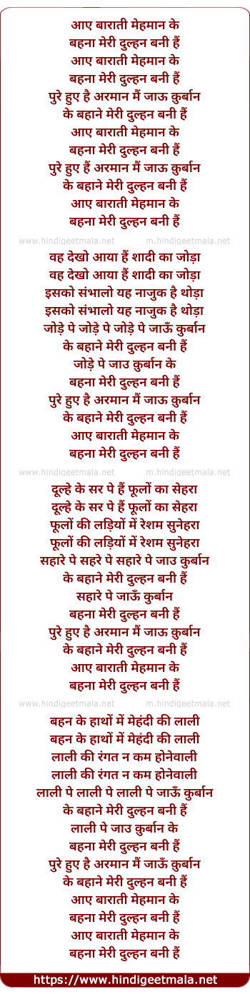 Lyrics of Aaye Baaraati Mehmaan Ke Behana Meri (Sad) - आए बाराती मेहमान के बहना मेरी