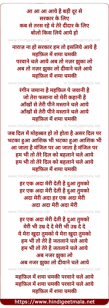 Lyrics of Aaye Hai Badi Dur Se Mahfil Me Shama Chamki Parwane - आये है बड़ी दूर से महफ़िल में शमा चमकी परवाने