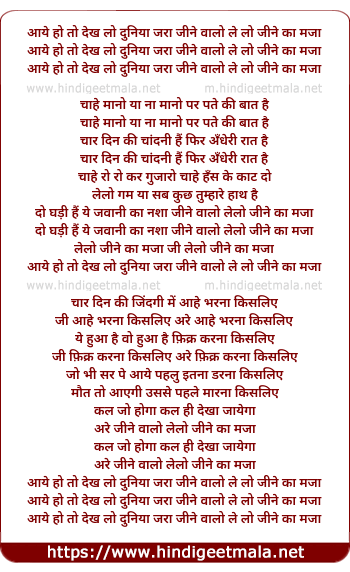 Lyrics of Aaye Ho Dekh Lo Duniya Zara Jine Walo Le Le Jine Ka Maza - आये हो तो देख लो दुनिया जरा जीने वालो ले लो जीने का मजा