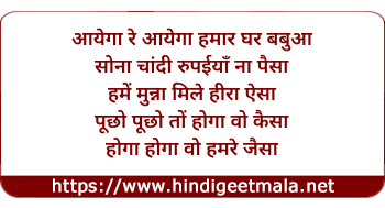 Lyrics of Aayega Re Aayega Hamara Ghar Babua, Sona Chandi Rupiya Na Paisa - आयेगा रे आयेगा हमार घर बबुआ, सोना चांदी रुपईयाँ ना पैसा
