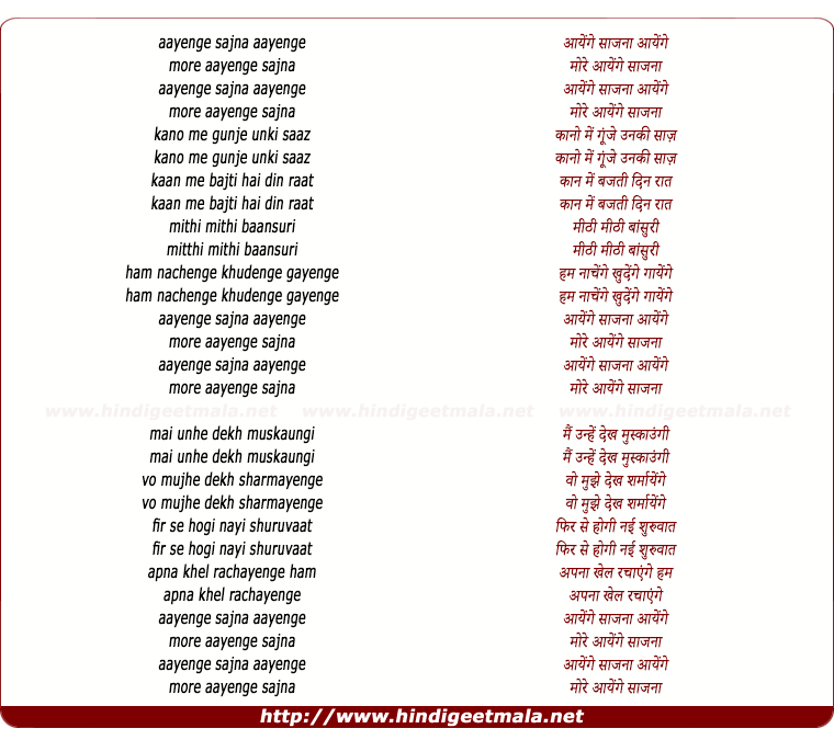 Lyrics of Aayenge Sajana Aayenge More - आयेंगे साजना आयेंगे