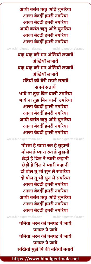 Lyrics of Aayi Basant Rut Odhe Chunariya - आयी बसंत ऋतु ओढ़े चुनरिया