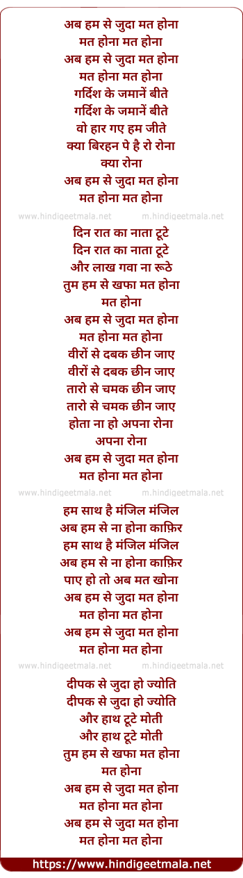 Lyrics of Ab Humse Judaa Mat Hona - अब हम से जुदा मत होना
