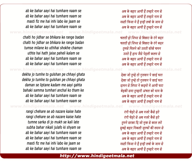Lyrics of Ab Ke Bahar Aayi Hai Tumhare Naam Se - अब के बहार आयी है तुम्हारे नाम से