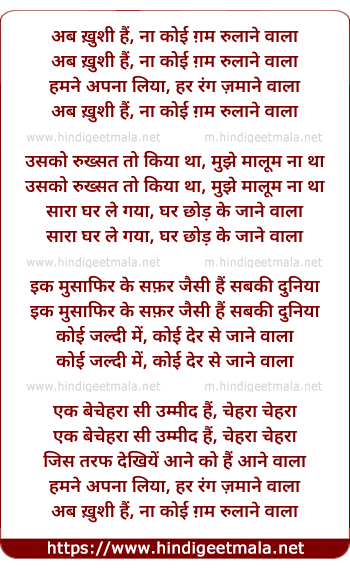 Lyrics of Ab Khushi Hai Na Koi Dard - अब ख़ुशी हैं, ना कोई ग़म रुलाने वाला