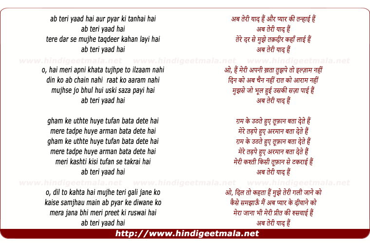 Lyrics of Ab Teri Yaad Hai - अब तेरी याद हैं