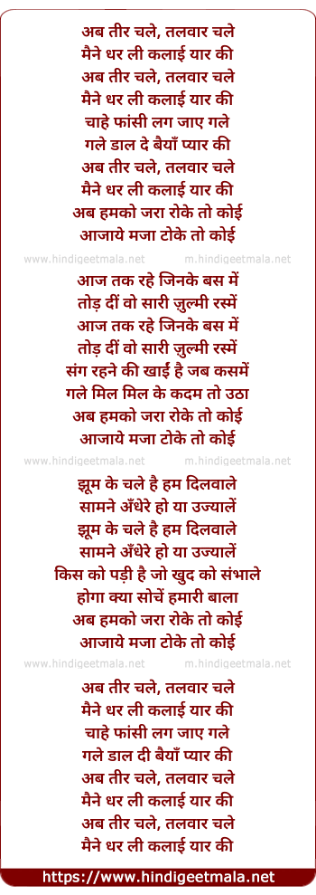 Lyrics of Ab Tir Chale Talvar Chale - अब तीर चले तलवार चले