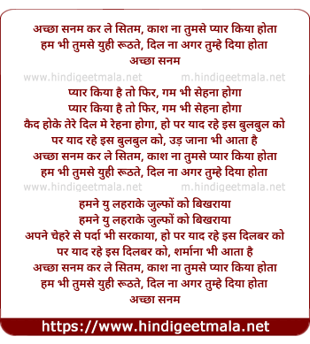 Lyrics of Achha Sanam Kar Le Sitam - अच्छा सनम कर ले सितम