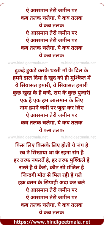 Lyrics of Ae Aasman Teree Jamin Par - ऐ आसमान तेरी जमीन पर