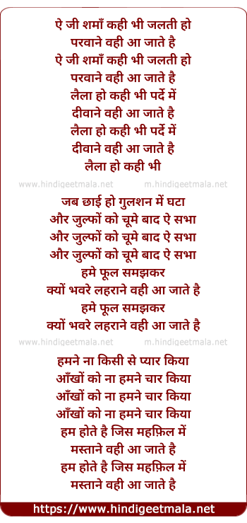 Lyrics of Ae Ji Shama Kahi Bhi Jalti Hai - ऐ जी शमाँ कही भी जलती हो