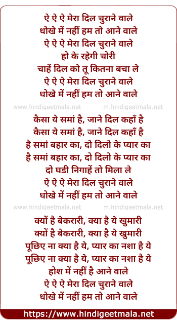 Lyrics of Ae Mera Dil Churane Wale Dhoke Me Nahi Ham To Aane Wale - ऐ मेरा दिल चुराने वाले धोखे में नहीं हम तो आने वाले
