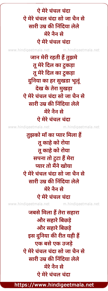 Lyrics of Ae Mere Chanchal Chanda So Jaa Chain Se - ऐ मेरे चंचल चंदा सो जा चैन से