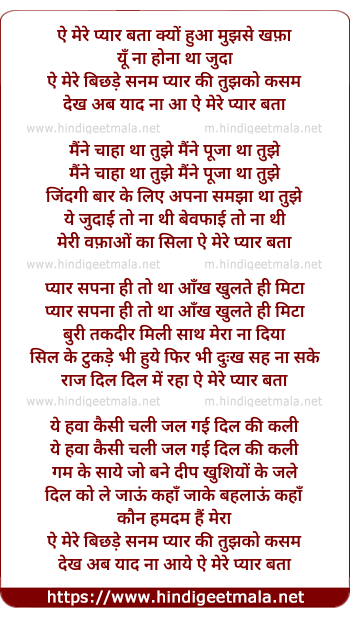 Lyrics of Ae Mere Pyar Bata Kyu Hua Mujhse Khata - ऐ मेरे प्यार बता क्यों हुआ मुझसे खफ़ा