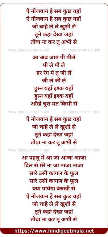 Lyrics of Ae Naujawan Hai Sub Kuch Yahan, Jo Chahe Le Le Khushi Se - ऐ नौजवान है सब कुछ यहाँ, जो चाहे ले ले खुशी से