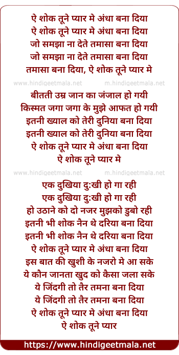 Lyrics of Ae Shaukh Tune Pyar Me Andha Bana Diya - ऐ शोक तूने प्यार मे अंधा बना दिया