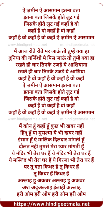 Lyrics of Ae Zamin Ae Aasman Itna Bata - ऐ ज़मीन ऐ आसमान इतना बता