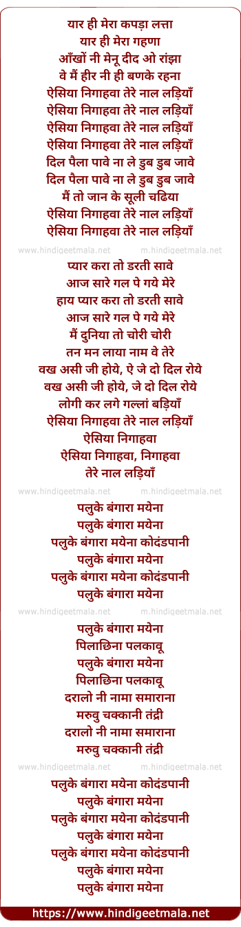 Lyrics of Aesian Nighawan Tere Nal Ladiya - यार ही मेरा कपड़ा लत्ता
