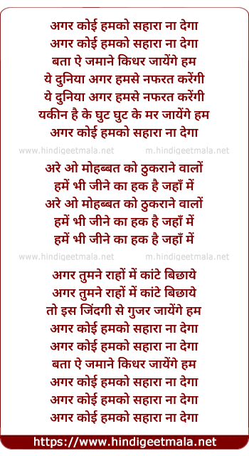 Lyrics of Agar Koi Humko Sahara Na Dega - अगर कोई हमको सहारा ना देगा