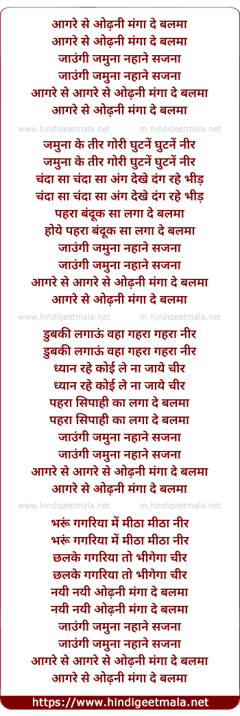 Lyrics of Agre Se Odhni Manga De Balma - आगरे से ओढ़नी मंगा दे बलमा
