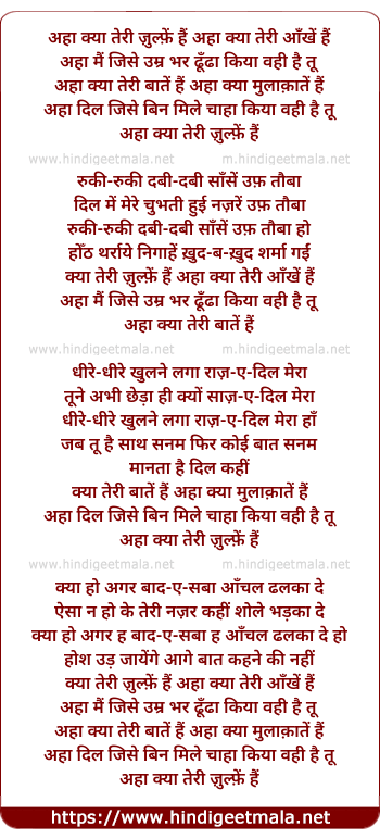 Lyrics of Ahaa Kyaa Teri Zulfen Hain Kyaa Teri Aankhen Hain - अहा क्या तेरी ज़ुल्फ़ें हैं अहा क्या तेरी आँखें हैं