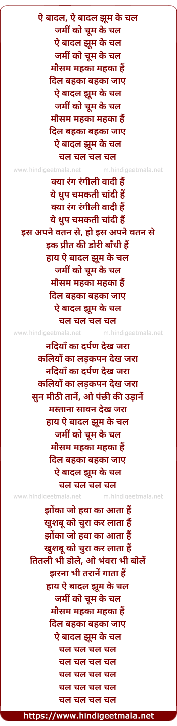 Lyrics of Ai Baadal Jhum Ke Chal - ऐ बादल झूम के चल