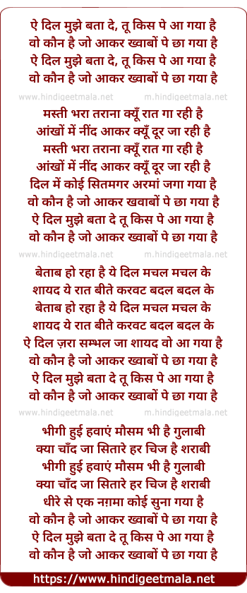 Lyrics of Ai Dil Mujhe Bata De, Tu Kis Pe Aa Gaya Hai - ऐ दिल मुझे बता दे तू किस पे आ गया है