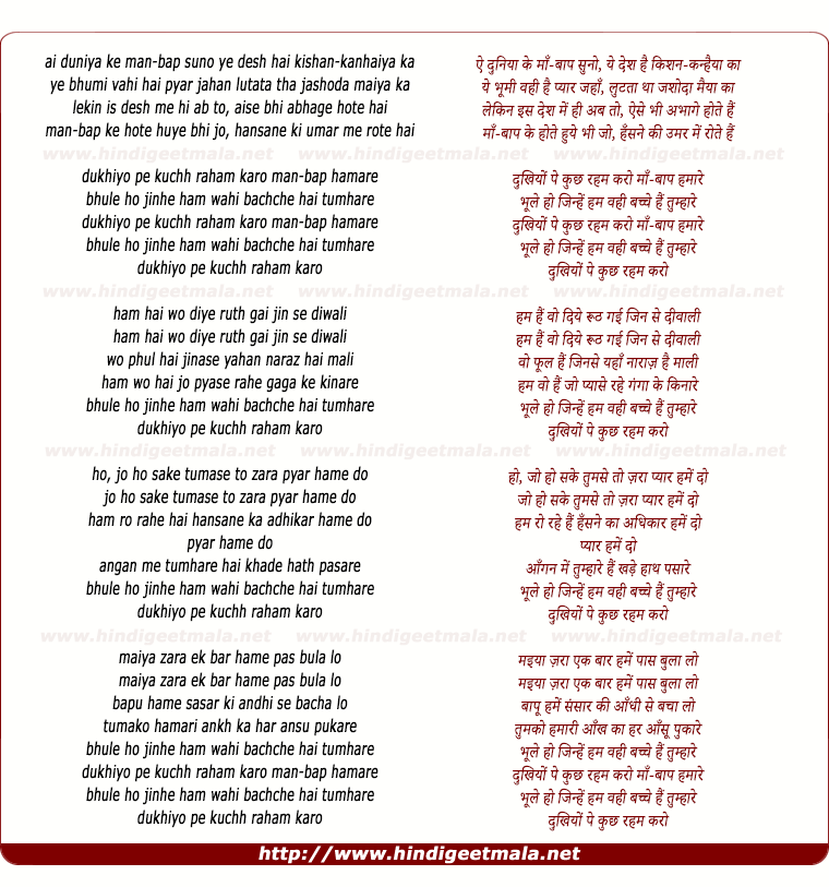Lyrics of Ai Duniyaa Ke Maa Baap, Dukhiyon Pe Kuchh Raham Karo - ऐ दुनिया के माँ बाप, दुखियों पे कुछ रहम करो