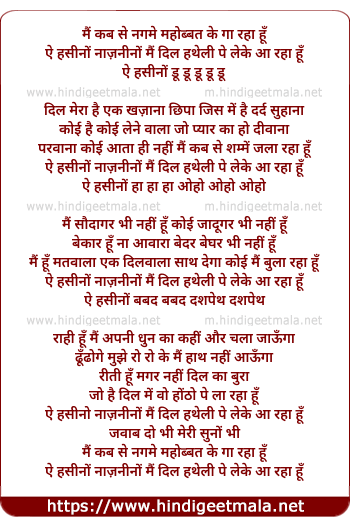 Lyrics of Ai Hasino Najanino Main Dil Hatheli Pe Leke Aa Raha Hu - ऐ हसीनों नाज़नीनों मैं दिल हथेली पे लेके आ रहा हूँ