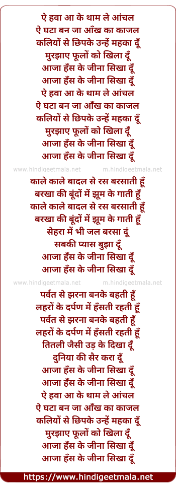 Lyrics of Ae Hava Aake Thaam Le Aanchal - ऐ हवा आके थाम ले आंचल
