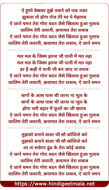 Lyrics of Ae Jane Chaman Tera Gora Badan Jaise Khilta Hua Gulab - ऐ जाने चमन तेरा गोरा बदन जैसे खिलता हुआ गुलाब