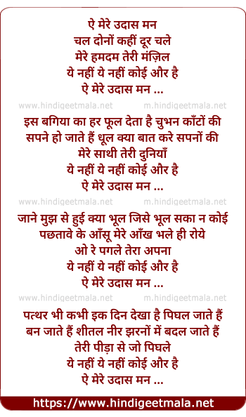 Lyrics of Ai Mere Udas Man - ऐ मेरे उदास मन
