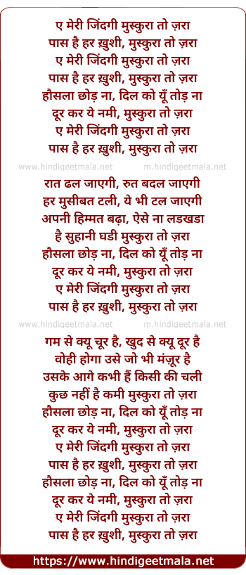 Lyrics of Ae Meri Jindagi Muskura To Jara - ए मेरी जिंदगी मुस्कुरा तो ज़रा