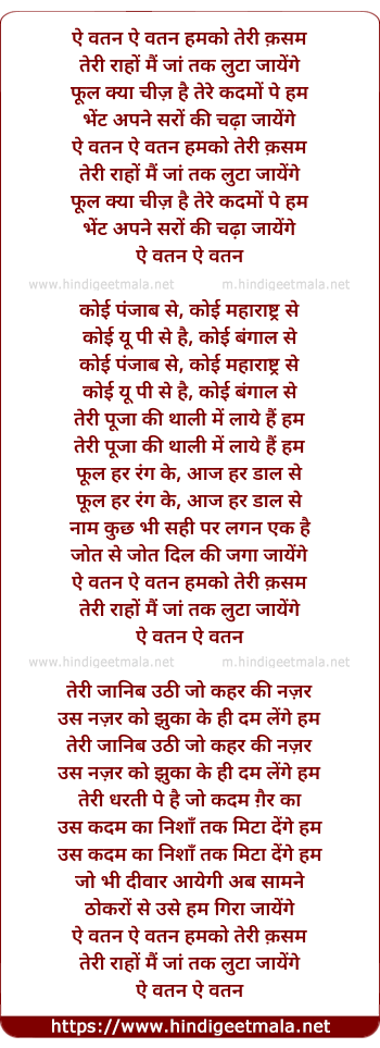 Lyrics of Ae Vatan Ae Vatan Hamko Teri Kasam (Part 2) - ऐ वतन ऐ वतन हमको तेरी क़सम