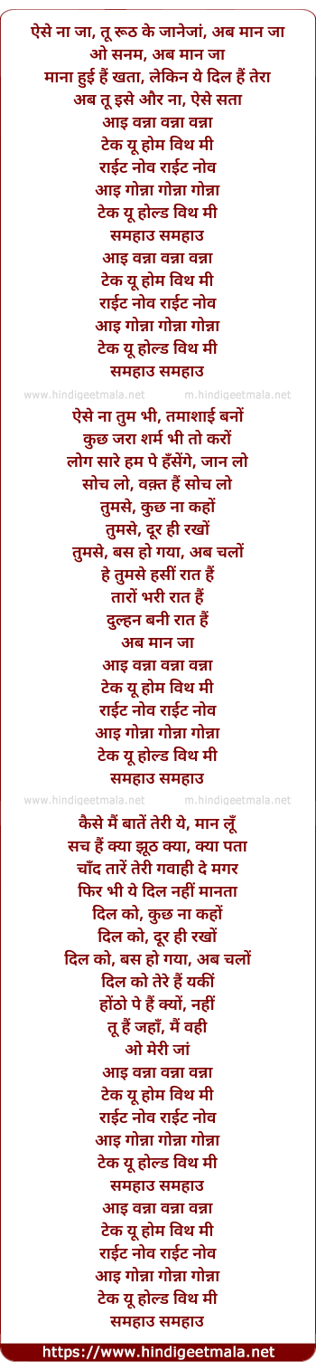 Lyrics of Aise Na Ja Tu Ruth Ke (Wanna Wanna) - ऐसे ना जा, तू रूठ के जानेजां, अब मान जा