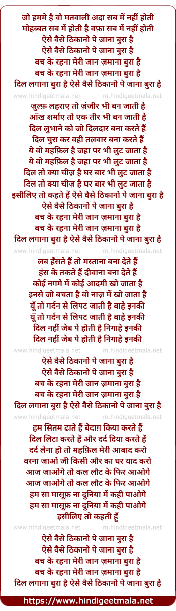 Lyrics of Aise Waise Thikano Pe Jaana Bura Hai - ऐसे वैसे ठिकानों पे जाना बुरा है