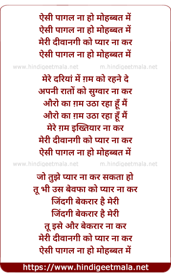 Lyrics of Aisi Pagal Na Ho Mohabbat Me - ऐसी पागल ना हो मोहब्बत में