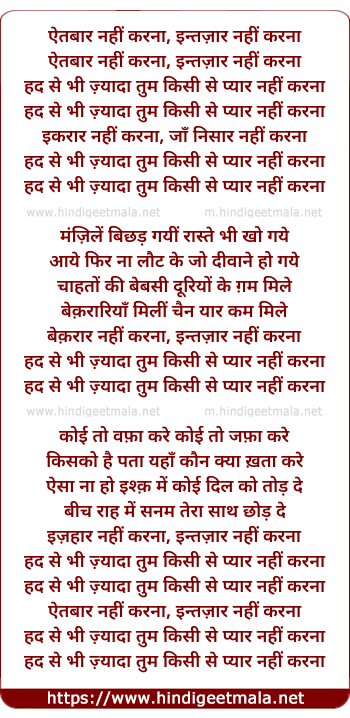 Lyrics of Aitabaar Nahin Karanaa Intajar Nahi Karna - ऐतबार नहीं करना इन्तज़ार नहीं करना