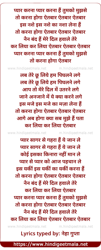 Lyrics of Aitbar..... Pyar Karna Hai Tumko Mujhse Toh - ऐतबार...... प्यार करना हैं तुमको मुझसे तो
